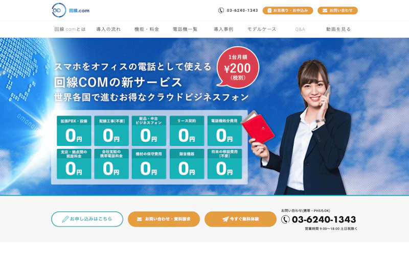 回線.COMは、スマホ1台あたり200円~という低コストで気軽に利用できるクラウドPBXサービスです。営業時間外や休業日には無料でアナウンスを流すことができます。基本的なPBX機能をコンパクトにまとめた使い勝手の良いプランが用意されています。