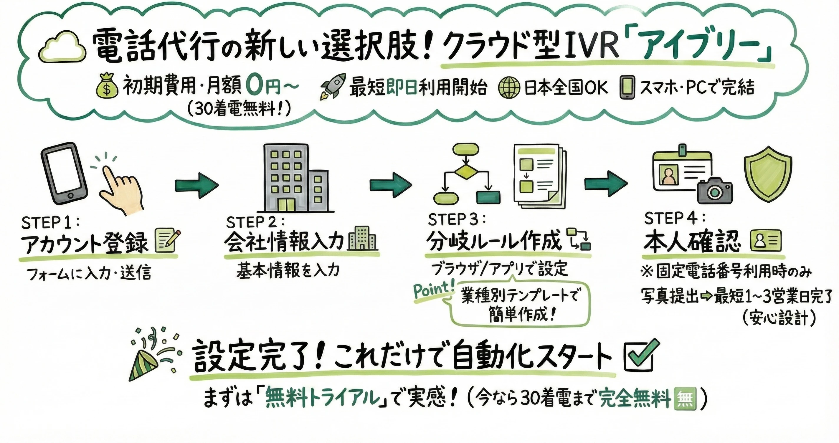 「アイブリー」は、IVRを活用したクラウド型のIVR(電話自動応答)サービスです。電話の着信時に音声ガイダンスが応答し、用件に応じて音声案内や転送を行います。