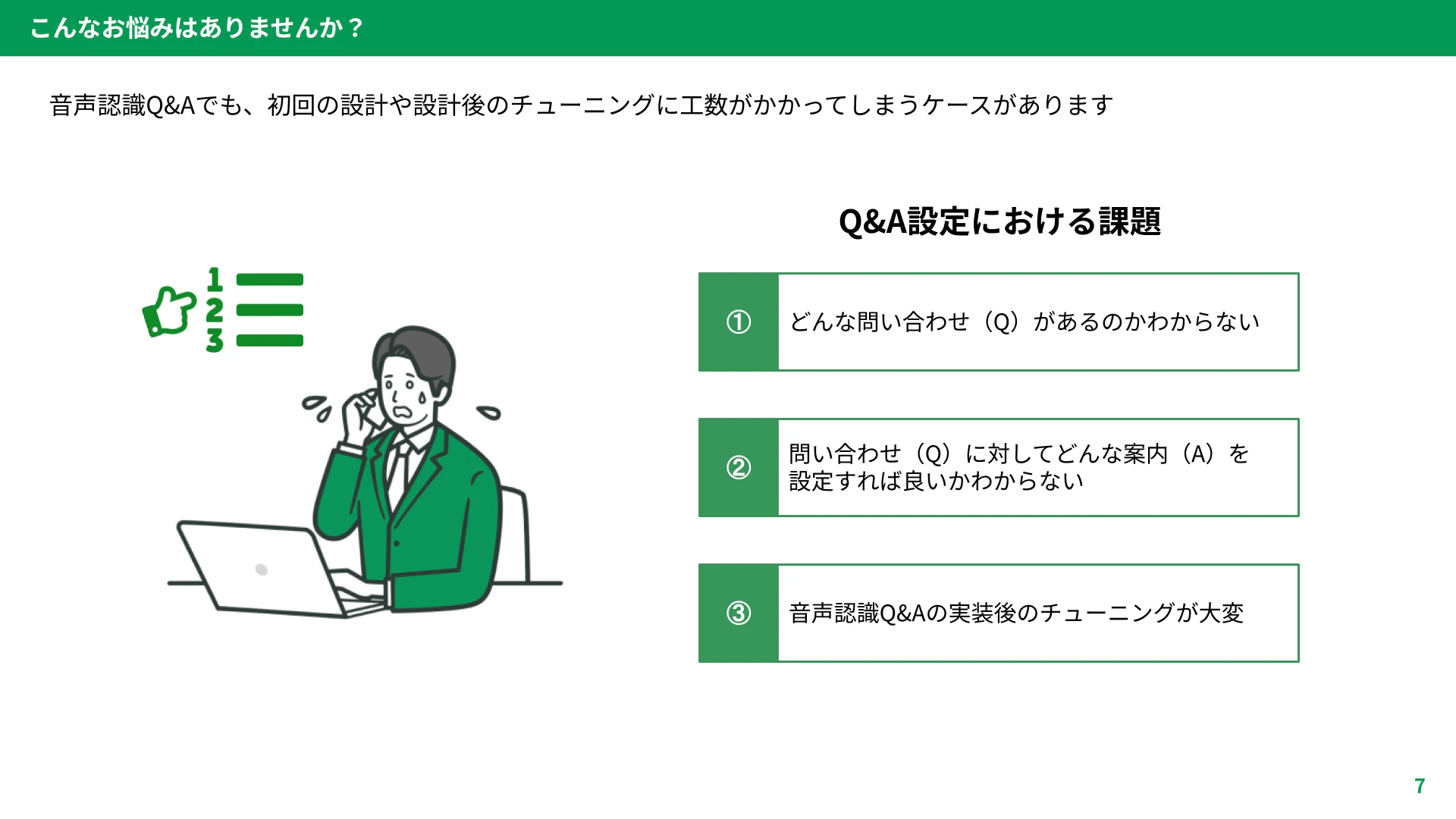 蓄積された通話データや既存資料をAIが解析し、「このような問い合わせが多いので、Q&Aを作成しませんか?」と管理画面上で提案を行います。