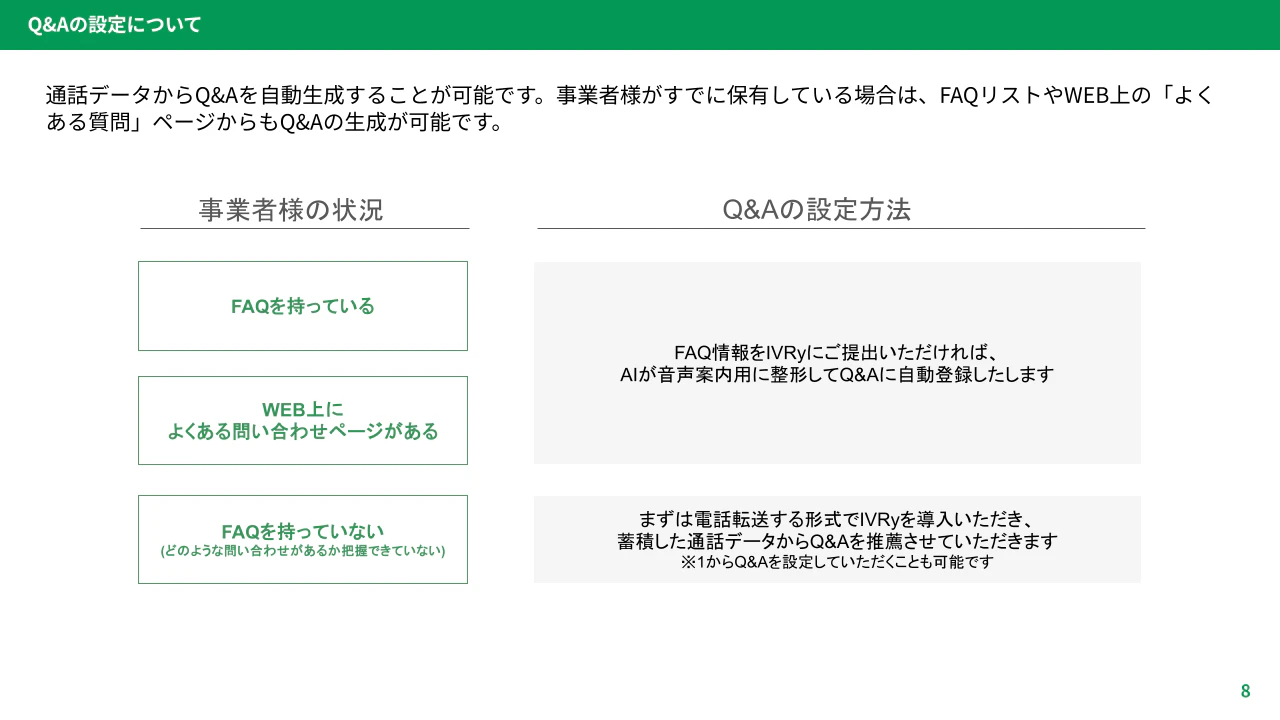 すでにFAQや「よくある質問」をお持ちの場合は、そのデータをアイブリーに提出するだけで、AIが音声案内用に整形して自動登録します。