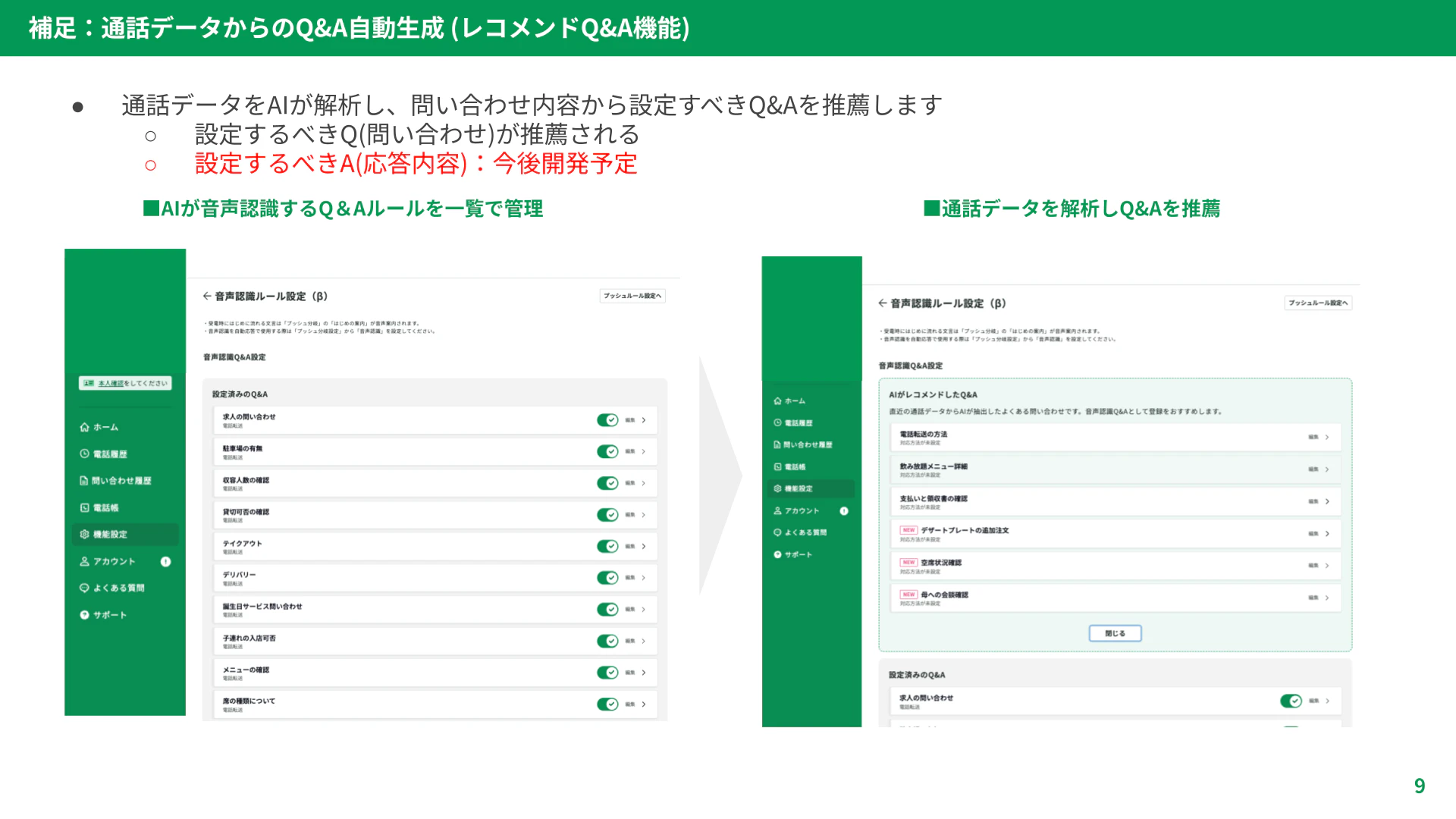 必要に応じて微調整を行い、承認ボタンを押すだけで、即座に電話対応の自動応答ルールとして適用されます。このサイクルを繰り返すことで、対応品質が自動的に向上していきます。