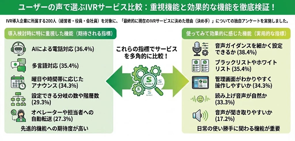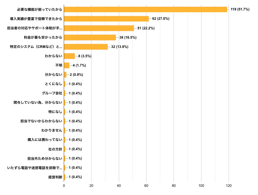 IVRy編集部がIVR導入企業に所属する200人を対象に行った独自アンケートの結果、過半数(51.7%)が「機能性」を最大の決め手としており「料金の安さ」は4位にとどまることが分かりました。