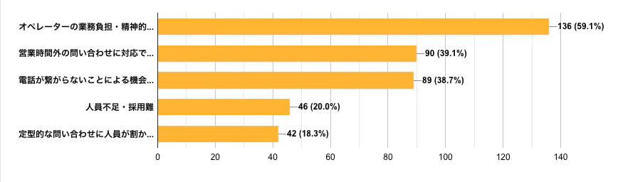 編集部では、経営者や役員を含む25歳〜65歳の会社員200人にアンケートを実施。IVR(電話自動応答)を導入することで解決したかった課題とは何かをたずねる設問には、「オペレーターの業務負担・精神的ストレス」と回答した方が59.1%と半数を超えました(複数回答可)。電話対応は、大きな負担やストレスになっていることがうかがえます。