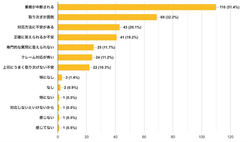 その結果、51.4%の方が「業務が中断される」と回答。「取次が面倒」(32.2%)、「対応方法に不安がある」(20.1%)と続きました。