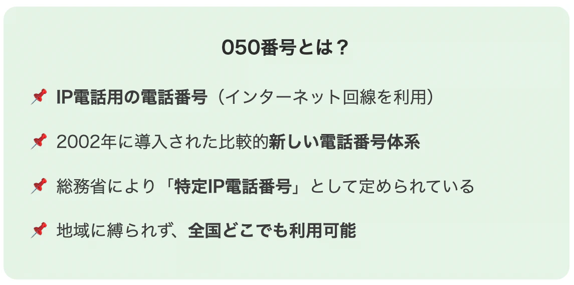 • 050番号:インターネット回線を利用するIP電話で使われる番号(例:050-XXXX-XXXX)