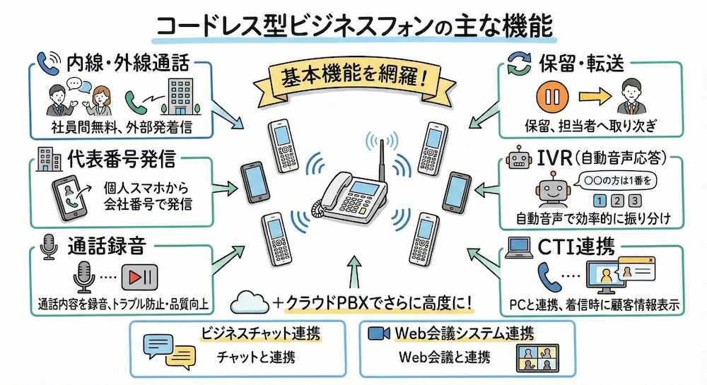 無線ビジネスフォンは、一般的なビジネスフォンが持つ基本機能を網羅しています。