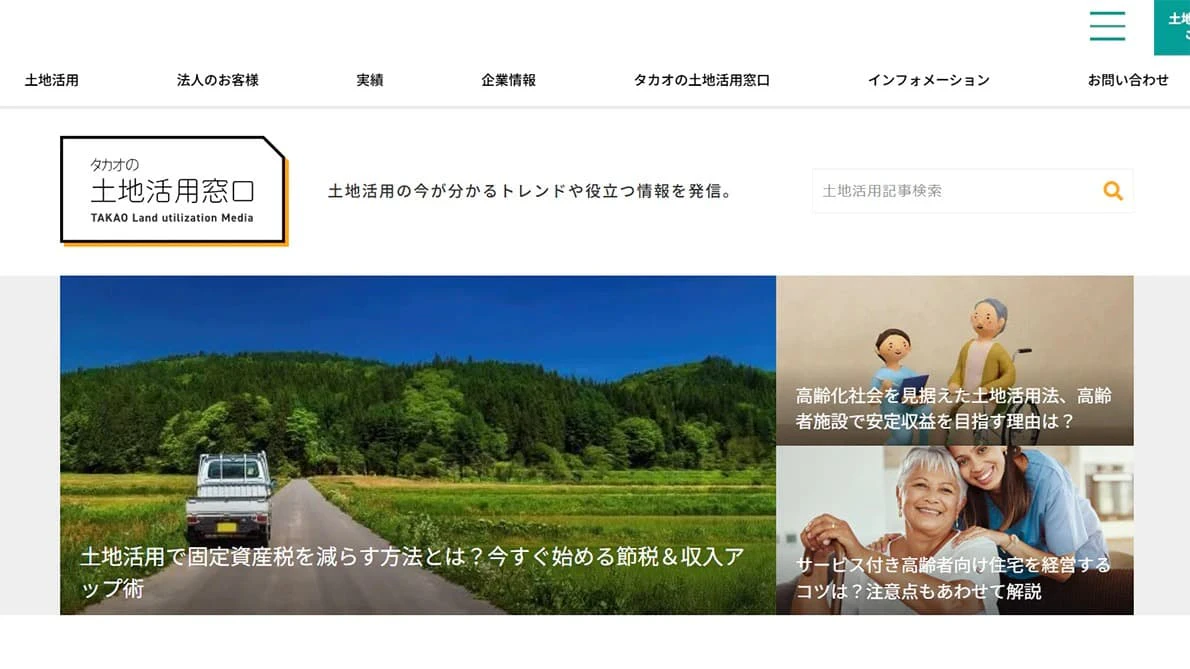 また、自社メディア「タカオの土地活用窓口」では、土地活用に役立つ情報やトレンドを日々発信しています。
