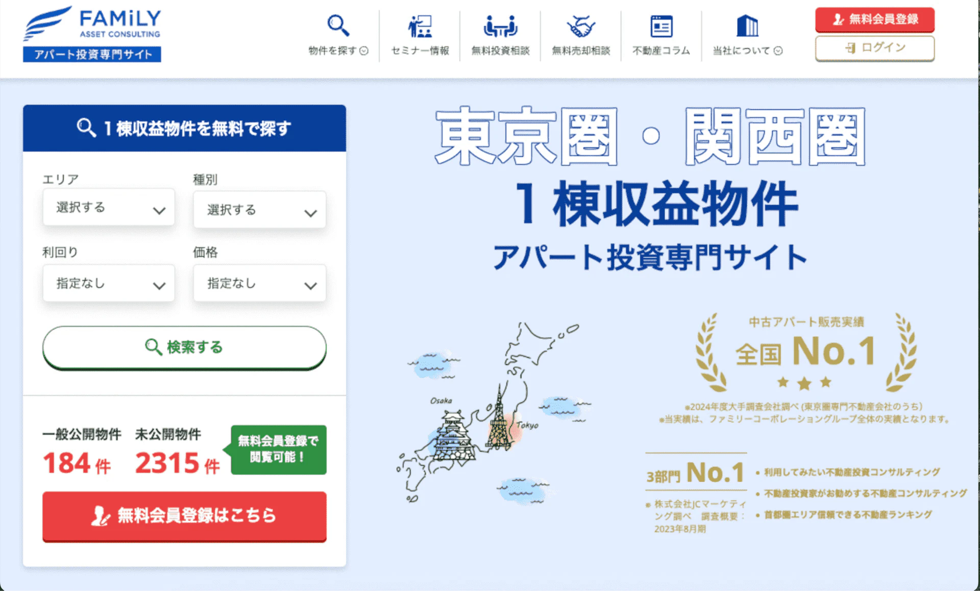 中古アパート投資ならファミリーアセットコンサルティング。年間400件を超える取引実績があり、富裕層だけでなくあらゆる層の資産形成をサポートしています。東京圏・関西圏を中心に、一棟収益物件のご紹介を専門としています。さらに、不動産の購入から運用、売却、税金対策まで一貫したサポートを行っており、不動産投資が初めての方でも安心してご利用いただけます。