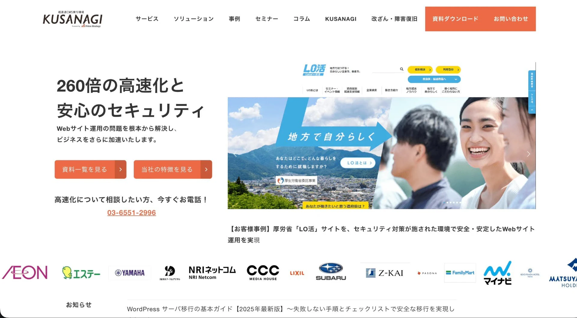 「KUSANAGIサービスサイト」は、上場企業の「プライム・ストラテジー株式会社」が開発・提供する『超高速CMS実行環境 KUSANAGI』を中心としたサービスについて掲載しています。
