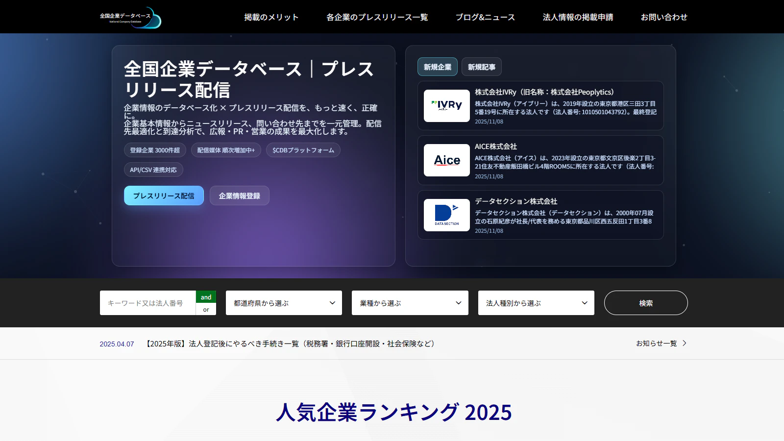 「全国企業データベース」は、法人基本情報から最新のプレスリリース、問い合わせ先までを「一元管理」できるクラウド基盤サービスです。
