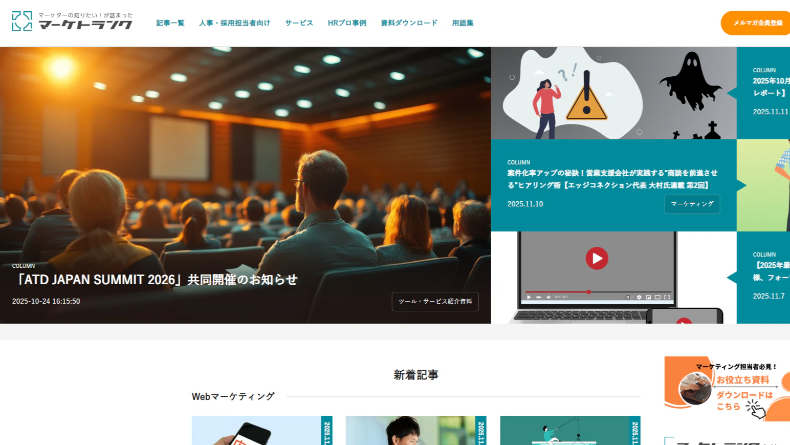 マーケティングのノウハウ、業務効率化に関する情報、SEOに強いコンテンツマーケティング、人事データに基づいたソリューションなど実務に必要な幅広い情報を提供しています。すべてのコンテンツが無料でご覧いただけます。(会員登録不要・会費などもありません。)