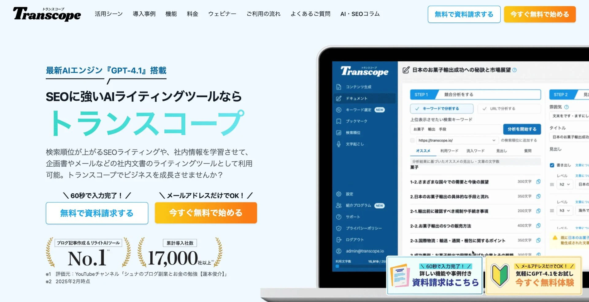 シェアモル株式会社が運営する、SEOに強いAIライティングツール「トランスコープ」は、ChatGPTを開発したOpenAI社のAPIであるGPT-4.1を活用したAIライティングツールです。効率的にSEOに強い高品質な文章を生成することができます。