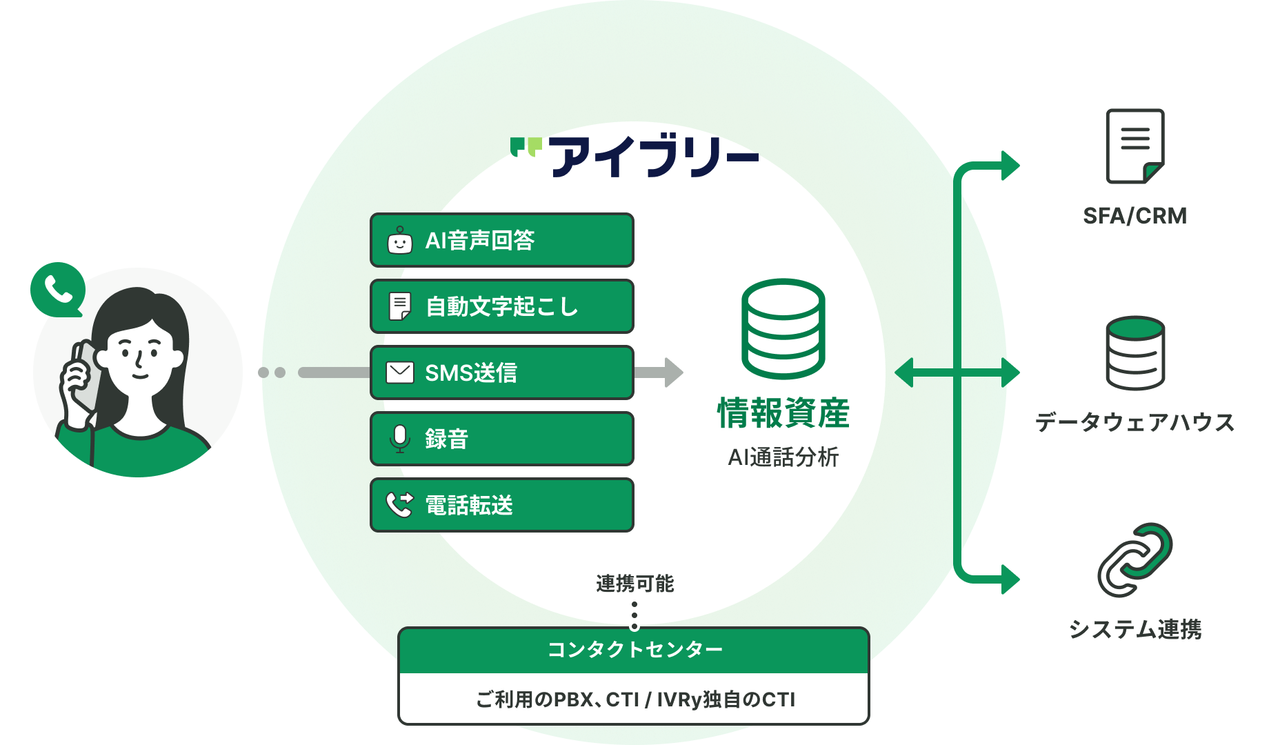 AI対話型の電話自動応答を軸に対話データの分析、SFA・CRM・データウェアハウスなどとの連携まで。 IVRy独自のCTIの利用や既にご利用のPBX/CTIと併用し、コンタクトセンターでも活用頂けます。