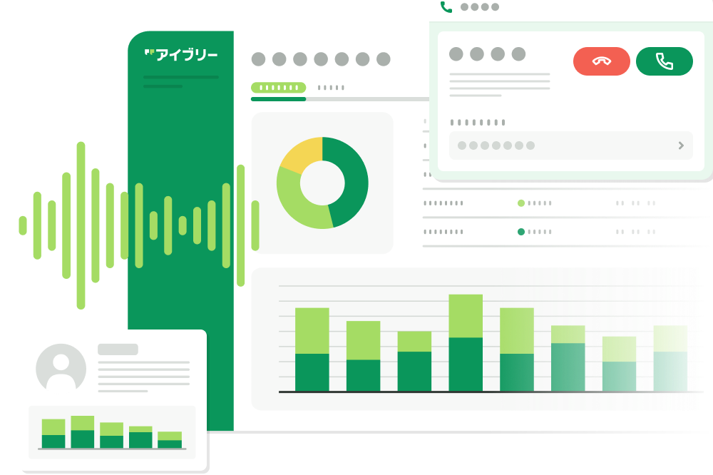 "アイブリー"のAI対話が電話にまつわる顧客体験を改善し、業 務効率を飛躍的に高めます。すべての対話を価値あるコミュニケーションデータに変換し、現場の課題解決から収益の最大化までデータドリブンな意思決定を支援します。