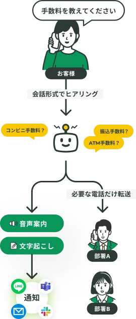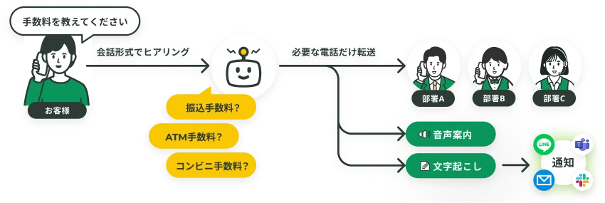 受電すると、内容に応じてAIが適切に振り分け、電話業務の自動化を実現