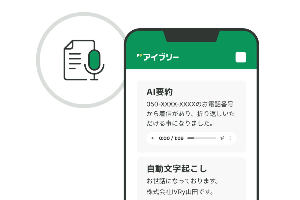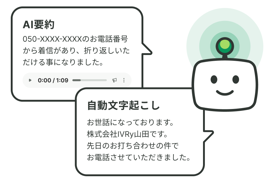 アイブリー経由のすべての通話を自動録音し、AIが会話内容を即座にテキスト化。音声を聞き直す手間をなくし、リスク管理から業務効率化、対応品質の向上まで、電話業務のあり方を根本から変えます。