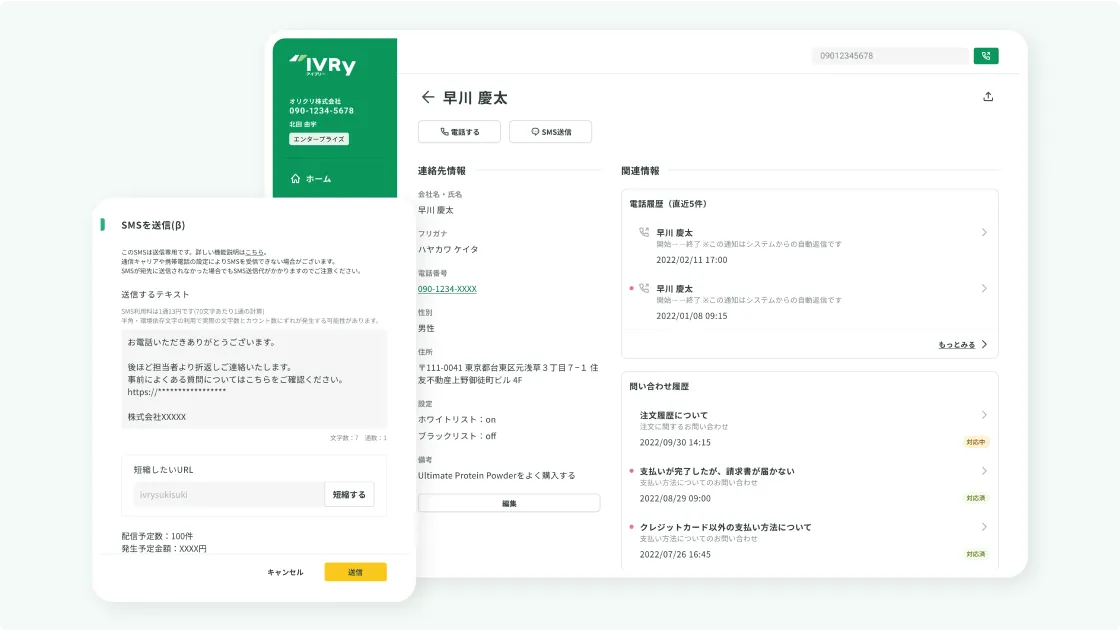 電話番号に紐づく顧客情報や通話履歴を自動で蓄積。着信時に相手の名前や過去の対応を即確認できます。