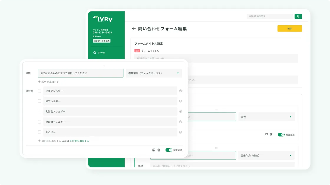 自由記述、日付・時刻形式、ラジオボタン・チェックボタンなどから自由な設問を組み合わせることで予約や忘れ物フォームを簡単に作ることができます。