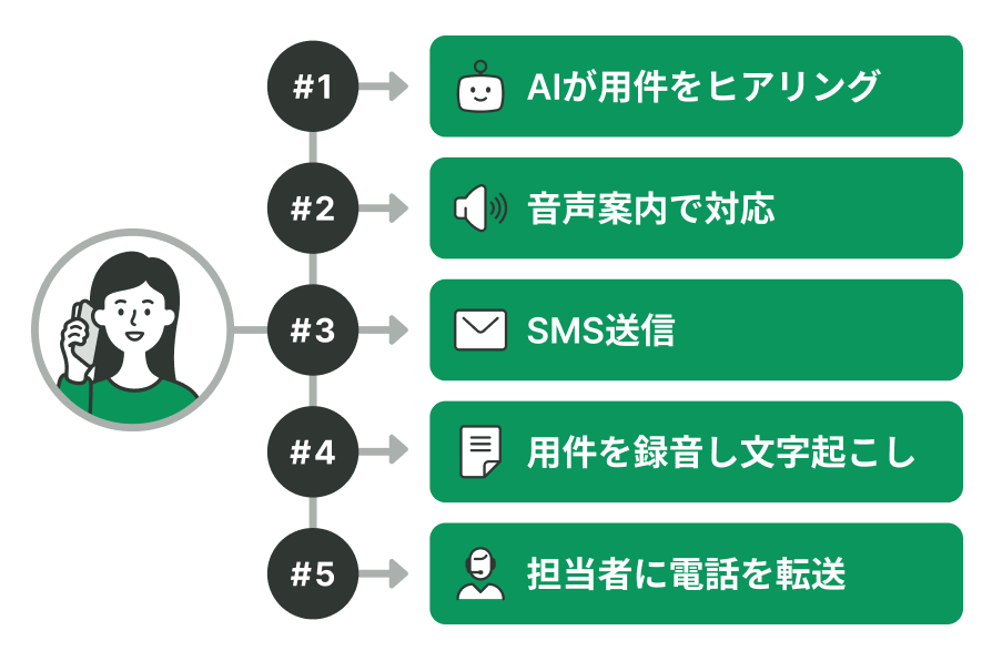 担当者への転送、自動音声による回答、SMS送信など、用件に応じた対応を24時間365日自動で行うことが可能です。