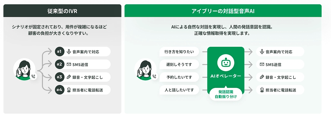 アイブリーは、企業や店舗にかかってくる電話をAIが自動で受付・対応する対話型音声AIサービスです。従来のボタン操作型IVRに加え、発話内容をAIが音声認識し、自然な会話で応答・振り分け・ヒアリングを行います。