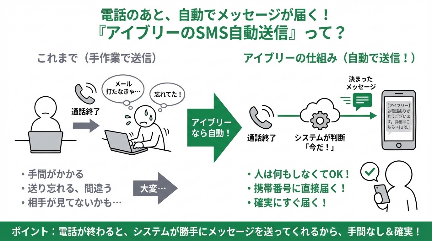 電話自動応答システム「アイブリー」のSMS自動送信機能を使えば、通話が終了したタイミングで顧客の携帯電話へ自動でSMS(ショートメッセージ)を送信できます。