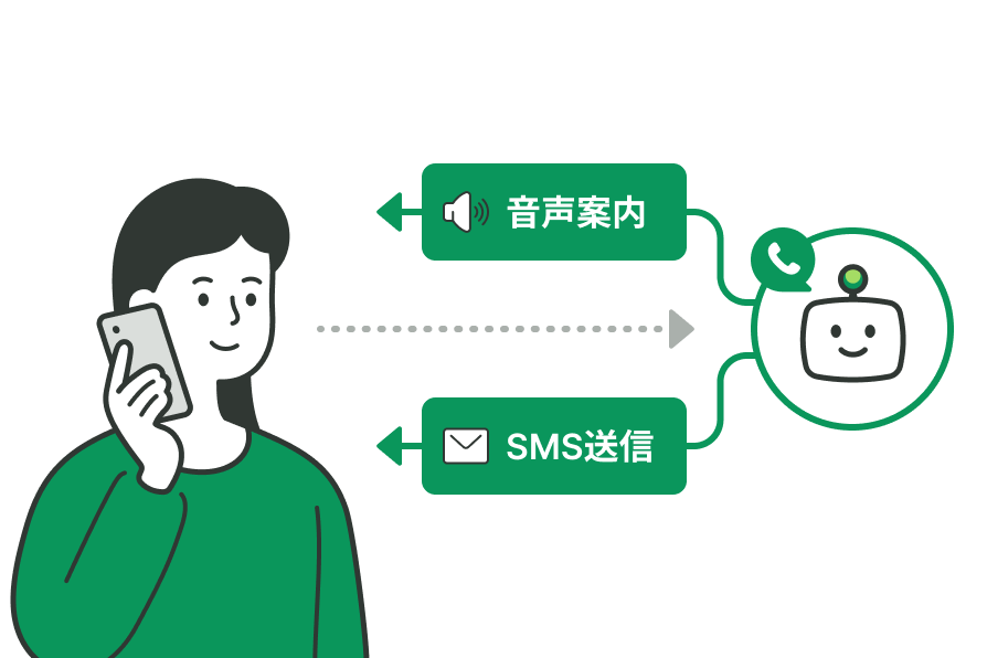 オペレーターの代わりにAIシステムが電話に対応。用件のヒアリング、SMS送信、担当者への転送を自動で行い、圧倒的な低コストで「電話に出られない」課題を解決します。